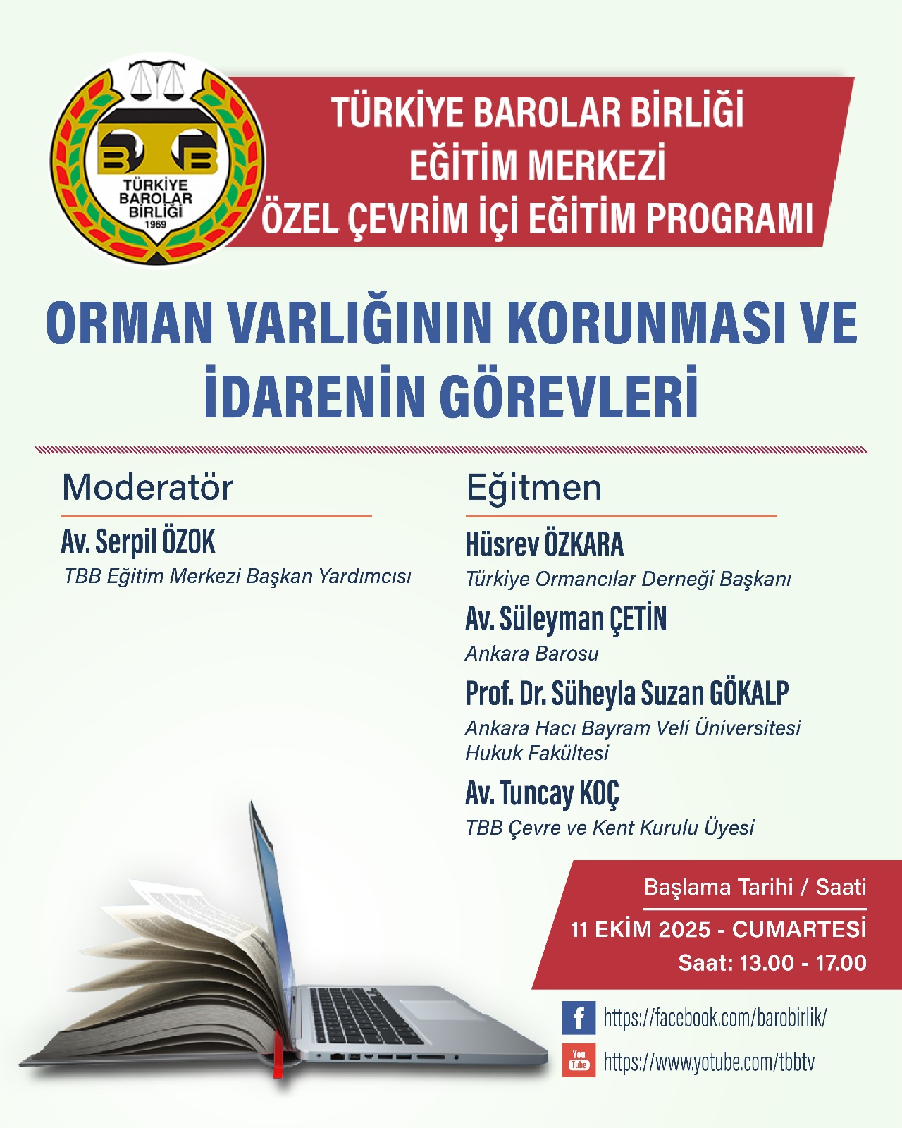 "Orman Varlığının Korunması ve İdarenin Görevleri"konulu çevrim içi eğitim programımız, 11 Ekim 2025 Cumartesi günü, saat 13.00-17.00 arasında sosyal medya hesaplarımız üzerinden gerçekleştirilecektir.
