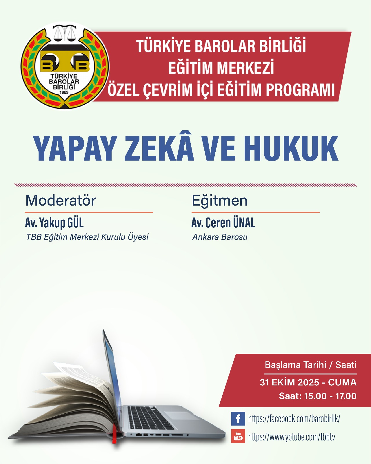 "Yapay Zeka ve Hukuk"konulu çevrim içi eğitim programımız, 31 Ekim 2025 Cuma günü, saat 15.00-17.00 arasında sosyal medya hesaplarımız üzerinden gerçekleştirilecektir.