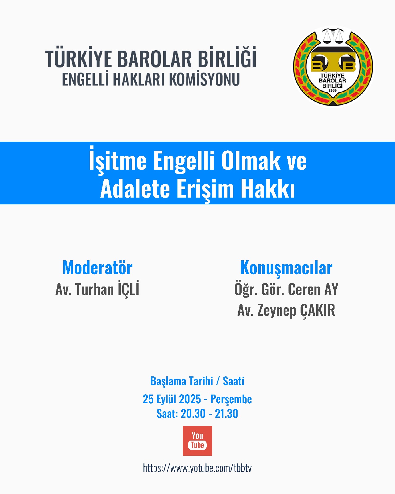 Türkiye Barolar Birliği Engelli Hakları Komisyonu tarafından gerçekleştirilecek "İşitme Engelli Olmak ve Adalete Erişim Hakkı" konulu online etkinliğimiz, 25.09.2025 (Perşembe) saat: 20:30'da youtube kanalımız üzerinden yapılacaktır.